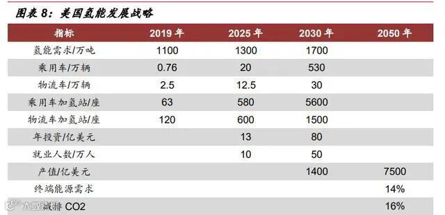 2014 年美国颁布的《全面能源战略》确定了氢能在交通转型中的引领作用,并 规划 2030~2040 年将全面实现氢能源经济。美国能源部 2019 年提出了《国家氢能 发展路线图》。目前美国氢能重点发展领域一是开展燃料电池系统研发,各级政府均 提供大量资金资助科研机构进行氢能和燃料电池关键零件研发工作。二是布局建设加 氢站,如美国加州每年计划拨款 2000 万美元用于加氢站建设,直到加州至少有 100 座加氢站;到 2025 年建立 200 座加氢站。截至 2018 年底,美国建有加氢站 42 座, 氢燃料车 5899 辆。