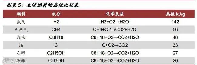 氢气是常见燃料中热值最高的(142KJ/g),约是石油的 3 倍,煤炭的 4.5 倍。这 意味着消耗相同质量的石油、煤炭和氢气,氢气所提供的能量最大,这一特性是满足 汽车、航空航天等实现轻量化的重要因素之一。