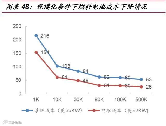规模效应下,燃料电池系统成本有望下降至 40 美元/kW