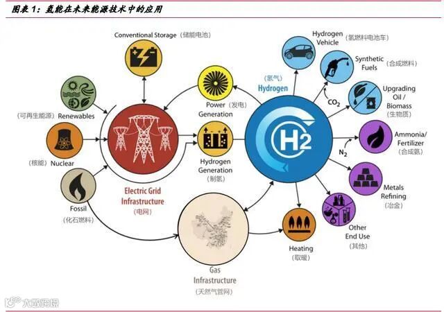 氢能作为一种清洁、高效、安全、可持续的二次能源,可通过一次能源、二次能 源及工业领域等多种途径获取,氢能将成为第三次能源变革的重要媒介。氢能可以用 于交通运输,作为石油精炼、氨生产的原料,以及金属精炼和住宅部门的加热和烹饪 等方方面面。而且,氢气有潜力成为整合不同基础设施的能源载体,以提高经济效率、 可靠性、灵活性,而且其中许多用途将有助于减少电力和交通部门的碳排放。氢还可 以为电力部门提供大规模的长期