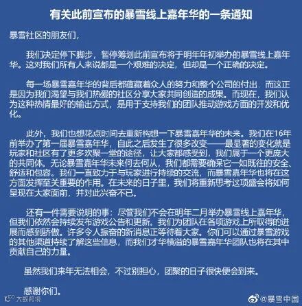 暴雪同时也对玩家安慰道:“即使我们没有2月份的暴雪线上嘉年华,他们仍然会为旗下的游戏发布公告和更新。会有许多令人兴奋的即将到来的消息和新闻与玩家社区分享。”