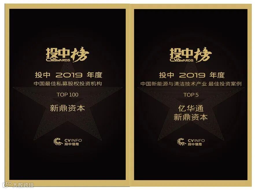 其中,新鼎资本荣获投中2019年度“中国最佳私募股权投资机构TOP100”;被投企业——亿华通荣获投中2019年度中国新能源与清洁技术产业最佳投资案例TOP5。