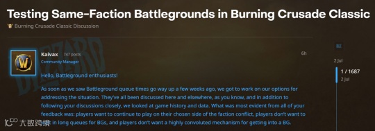 但归根结底,人机战场只是战争游戏的一种,处于PVP和PVE之间的尴尬地带。于是暴雪在9.1更新之际再发力,推出了“同阵营战场”系统。(蓝帖大意:战场排队时间大幅增加,不想让玩家们继续高度复杂的战场进入机制,从7月2日开始将启用同阵营战场),简单说就是战场排队会优先匹配敌对阵营,但如果无法快速匹配到对手,就会匹配同阵营玩家到对面,荣誉声望之类的照常进行。
