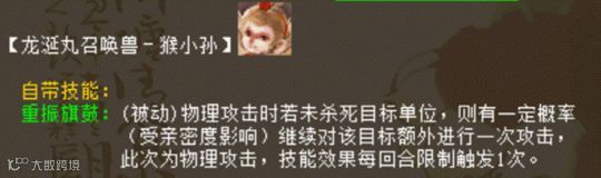 猴小孙【重振旗鼓】技能描述:(被动)物理攻击时若未杀死目标单位,则有一定概率(受亲密度影响)继续对该目标额外进行一次攻击,此次为物理攻击,技能效果每回合限制触发一次。