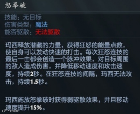 玛西的三技能跟四技能相对平平无奇,三技能可以为选定的友方英雄和她自身注入了吸血效果和攻击力加成,四技能则是让玛西在一段时间能不断地打拳,造成小范围伤害,并降低敌人的移动速度和攻击速度。