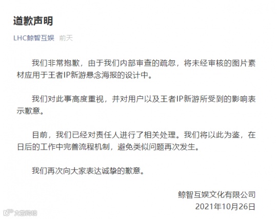 而早在10月26日,作为承接制作海报的外包公司深圳鲸智互娱就在自家的公众号上,对这件事进行了公开道歉和追责,并承诺已经对责任人进行了相关处理。伴随着《代号:零叁》官方致歉声明的发布,这件事才算告一段落。