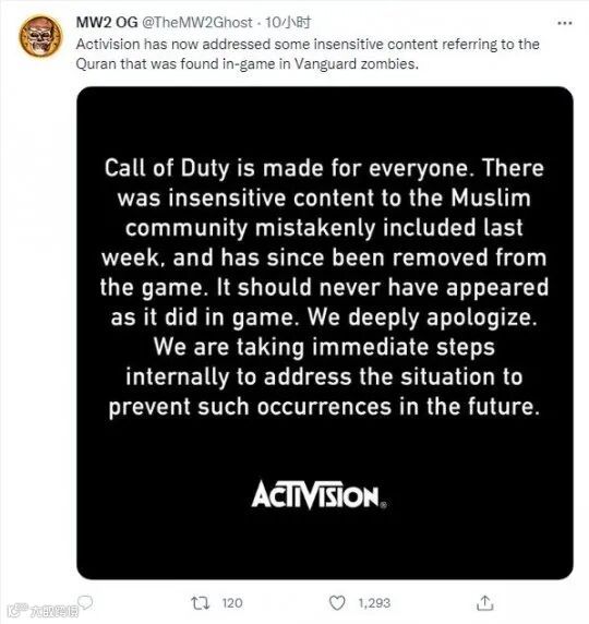 事情曝出来后不久,动视迅速更新补丁删除了《使命召唤18:先锋》出现的《古兰经》。紧接着还对广大玩家们致以了歉意,此事才算告一段落。