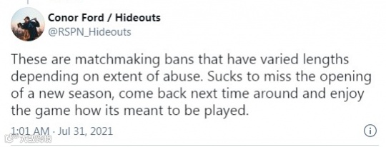 负责游戏系统安全的Conor Ford在推特中指出,这些被账号被封禁的市场会根据玩家们滥用Bug的次数来计算,但错过新赛季的开端是一定的。官方希望这些玩家在过了冷静期之后,再回来继续进行游戏。