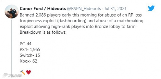 败方没有获得原有的“惩罚”,这个Bug的出现对比赛公平性的影响不言而喻。而令人感到讶异的是,在官方经过排查一举抓出的2086名卡过Bug的玩家中,PC玩家只占据很小的部分仅有44人,另有1965名PS4玩家、62名Xbox玩家以及15名NS玩家。