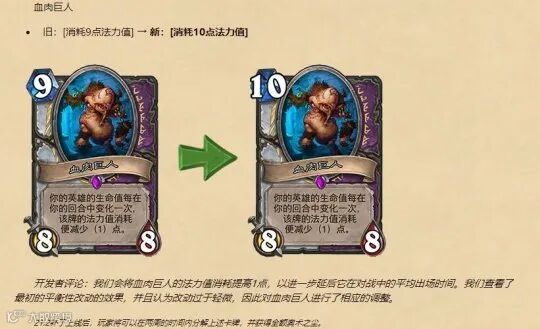 我们再来看血肉巨人的削弱,血肉巨人是继上一次的平衡补丁更新之后再一次遭到削弱。再加了1费之后,相当于任务术的铺场爆发能力又被推迟了一个回合。不过这张卡削弱的并不仅仅是术士,本来就不怎么强的牧师也是这次改动的受害者。目前标准模式的控制牧卡组当中有不少都带上了血肉巨人,此次削弱对于控制牧的铺场影响也非常大。