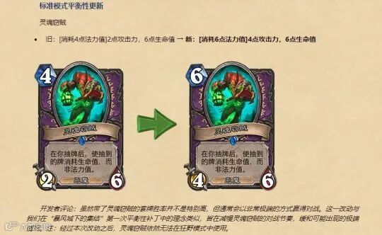 首先来看一下灵魂窃贼的削弱。在这一次的平衡补丁当中,灵魂窃贼是被加了2费,同时提升了2点攻击力。大家都知道灵魂窃贼这张卡的精髓完全不在攻击力,就是在它的作用效果。这一波削弱之后,原本标准术士在5费或者6费能够出现的斩杀基本上已经不可能实现,其马速被大大降低。