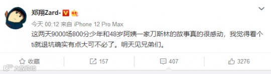 对于挖掘到这位铁血刀斯林,Zard本人也在微博表示:“这两天9000场800分少年和48岁阿姨一家刀斯林的故事真的很感动,我觉得看个ti就退坑确实有点大可不必了。”