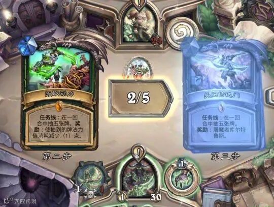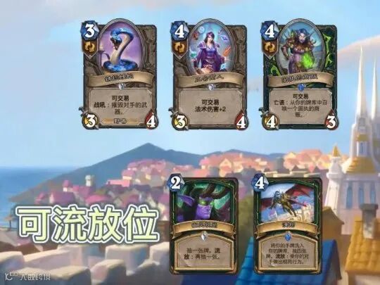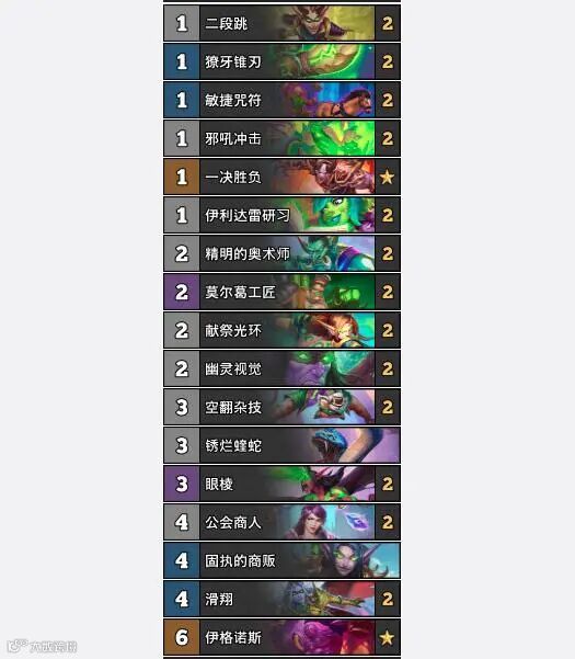 在起手留牌方面,可交易的牌都是可以留的。在面对快攻的时候,不要去留滑翔,因为这样很有可能给对手提速。1费的獠牙锥刃、二段跳、敏捷咒符和伊利达雷研习都是可以留的,不过需要注意,在打T7猎的时候需要留下献祭光环,这样在一定程度上能够缓解我们的场面压力。
