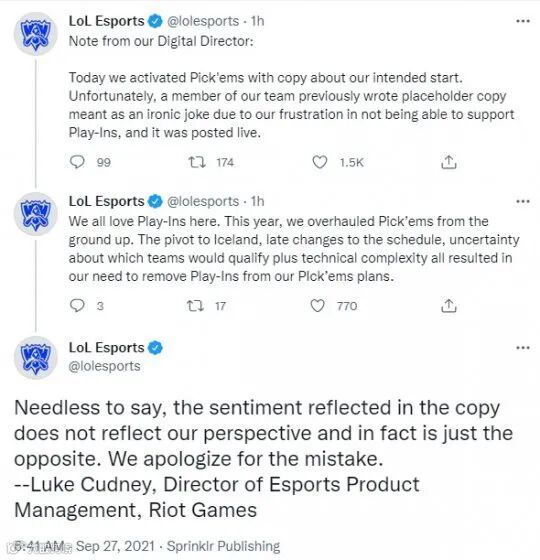拳头官方在9月27日进行了正面反馈,称他们在竞猜页面留下的不当言论,是临时工所为,不给竞猜活动添加入围赛的精彩,主要还是因为S赛举办地的临时更换,导致S11的赛程变得十分复杂,所以只能忍痛删除。