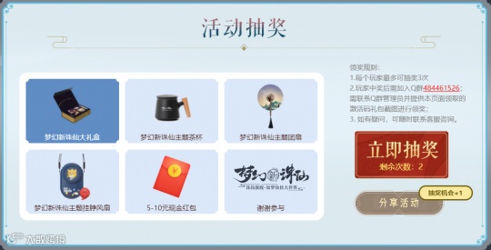 你以为这就完了?!没呢,还有活动抽奖!梦幻新诛仙大礼盒、梦幻新诛仙主题茶杯、梦幻新诛仙主题团扇、梦幻新诛仙主题挂脖风扇、5-10元现金红包,一大波周边红包抽奖正在等你...