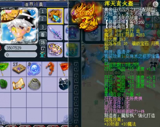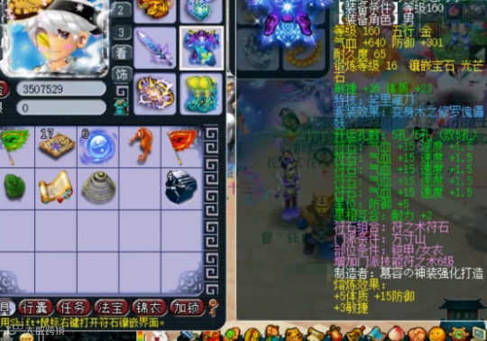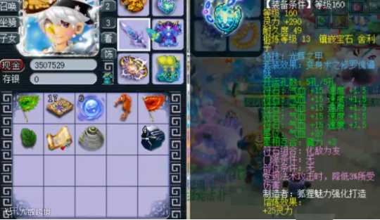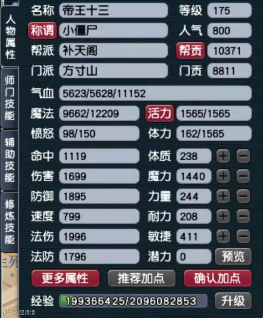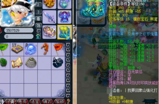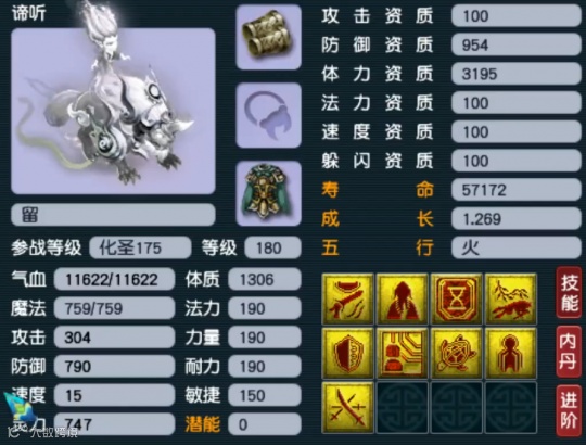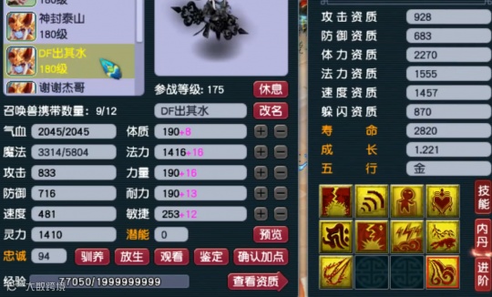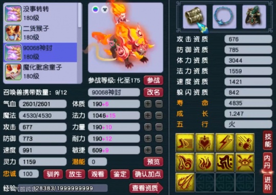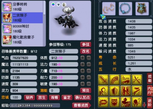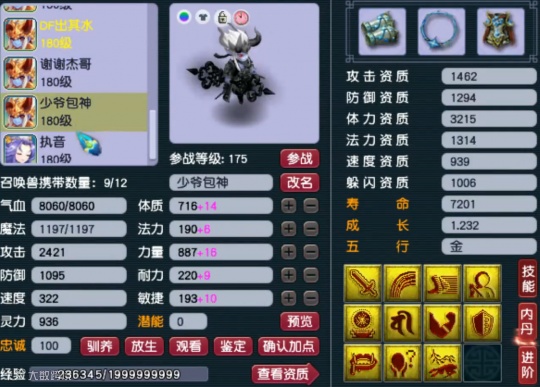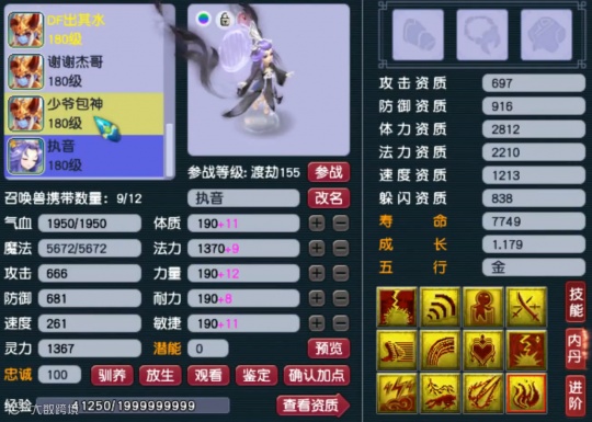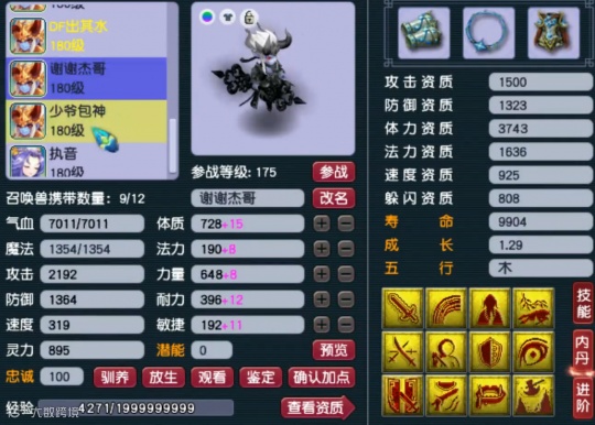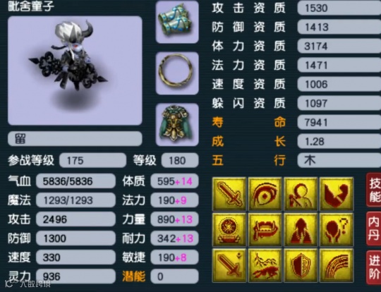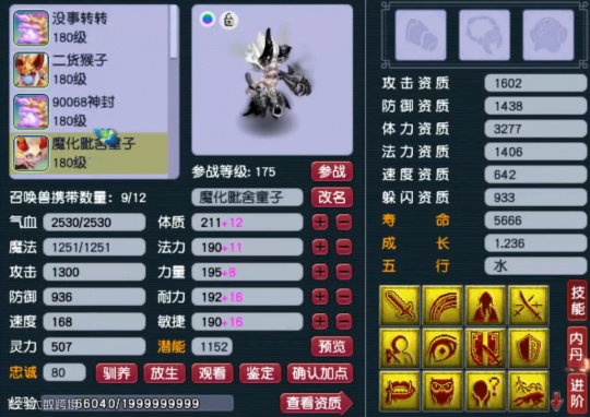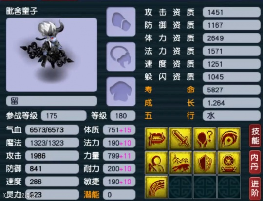 这是方寸山带比武装备任务全魔加点的属性,参考性并不大,接下来重头戏就是他的5特技装备和极品宝宝。