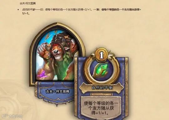接下来要说的就是JK了。原本的JK虽然也很强,但是由于随从是随机替换的,因此并不稳定。但是在新版本当中,JK的技能加了1枚铸币,变成了稳定的发现随从。小编觉得这波加强可以说是非常明显,JK有可能在新版本当中和恐龙大师布莱恩平分天下。而上个版本当中的最强英雄古夫则是遭到了削弱,原本+2/+1的英雄技能变成了+1/+1。失去了前期的压制力之后,预计古夫的排名也会有一个比较明显的下降。