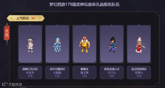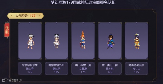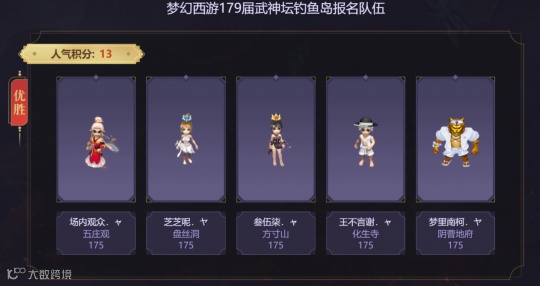 从钓鱼岛的报名图中看,他们依旧选用的是双封和国标点杀阵容,选用的五庄观、盘丝洞、方寸山也是武神坛赛场上的常客了。值得一提的是,钓鱼岛最近迎来了新队友,那就是梦幻西游代言人—杨洋的狮驼岭,有了物理门派加盟的他们已经摆脱了被限制的可能。