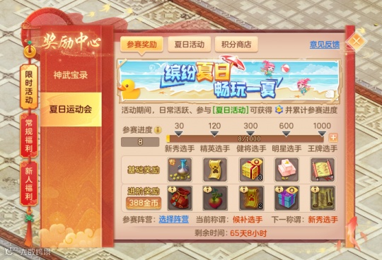 除了以上夏日运动会的六大活动,如果顺利攻略任务,就能累计获得一定的夏日积分,积分商店兑换领取包括夏日礼盒、还童丹、洗宠券、珍宝刷新券等奖励。当然啦,参赛选择不同阵营,也会获得对应阵营的称谓,最强的是“王牌选手”,奖励有高级宝图等。