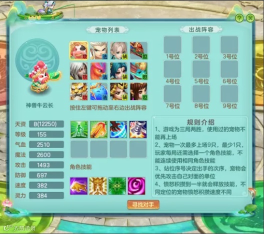 这是一个比较有趣味的宠物PK玩法,玩家在宠物大擂台玩法中可以派出自己的多个宠物出战,根据宠物的特点来排兵布阵。