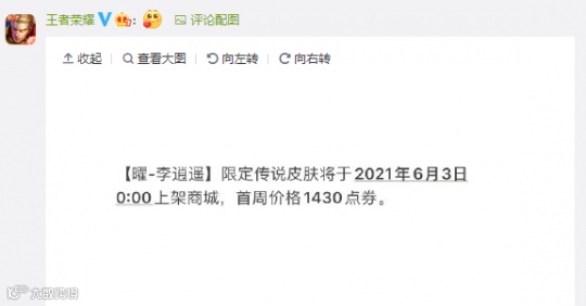 根据王者荣耀官博公布的消息,李逍遥传说皮肤将会在6月3日正式上线,首周价格143元。届时大家会选择冲一波吗?