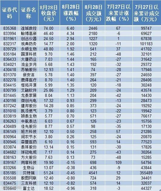 8月28日,32只精选层股票多数走强,连城数控以6.4%的涨幅领涨,股价再度创出晋层以来新高,同时刷新了挂牌新三板以来股价纪录。