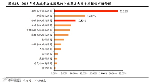 目前,心脑血管类药物在中成药销售市场中占份额最大。根据米内网的数据,2018年心脑血管疾病用药在国内重点城市公立医院中成药市场中占32.52%的市场份额,比肿瘤疾病用药(15.83%)远高出16.69%。