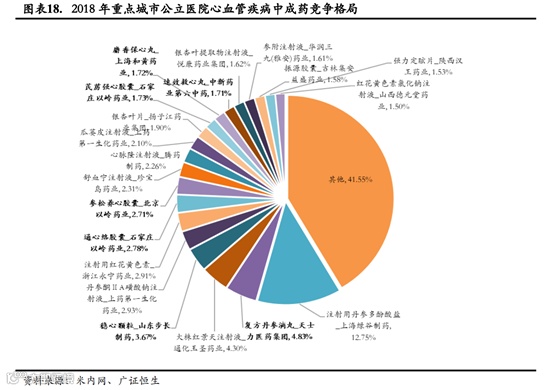 口服中成药看,2018年重点城市公立医院心血管疾病中成药市占率排名前3的分别是天士力的“复方丹参滴丸”(8.81%)、步长制药的“稳心颗粒”(6.69%)以及以岭药业的“通心络胶囊”(5.07%)。