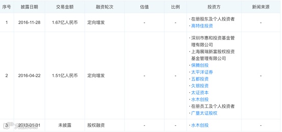 2016年4月,按每股15元价格,发行1005万股,募集资金1.51亿元,投后估值16.5亿;除息后每股价格14.25。