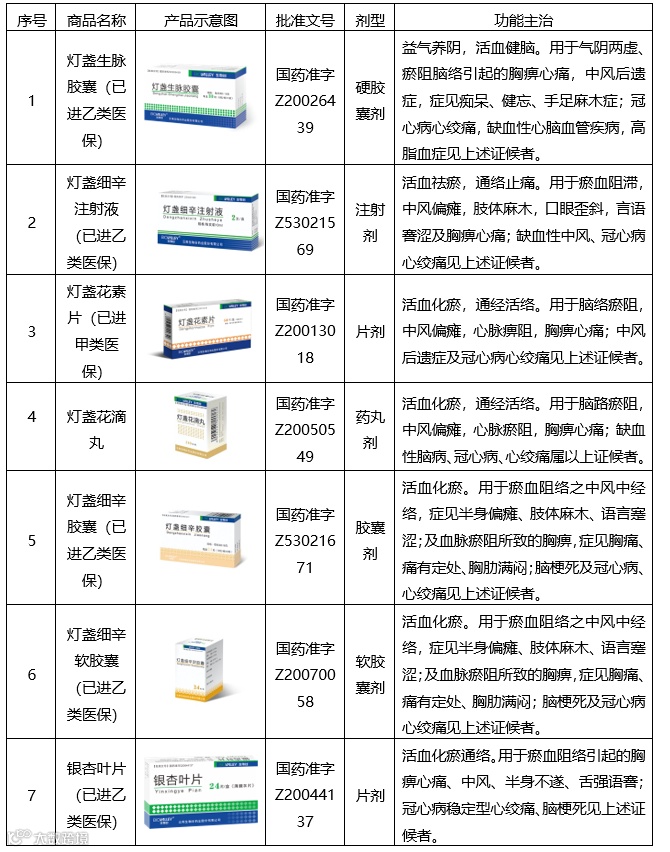 公司有七个灯盏花系列批准文号,涵盖注射剂、软胶囊、硬胶囊、滴丸、片剂五个剂型。目前主导产品为灯盏生脉胶囊和灯盏细辛注射液二个独家产品。