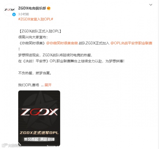 就在今天上午,ZGDX电竞俱乐部向外界正式官宣了加入决战平安京OPL联赛的消息,而这个俱乐部本身就是《你微笑时很美》剧集中战队的现实版本。梦幻联动、跨界联动网友们见多了,电视剧里的虚拟战队被组建成现实中的战队,这场面大伙还真没见过。