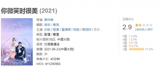 而在其正式上线后,诸如“3、2、1,开团!”、“一场比赛上百击杀”、“不尊重电竞的假赛言论”等新槽点,剧情和台词方面的各种硬伤,都导致了网友们后续对《你微笑时很美》产生更为强烈的抵制情绪。当前《你微笑时很美》获得了28万人的评价,评分仅有2.9分。