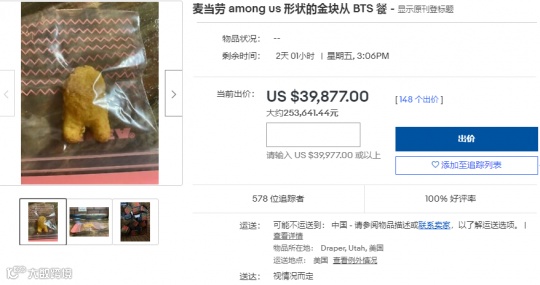 仅仅因为这个理由,作为拍品的鸡块被网友进行了超过140次的竞价,如今的价格已经来到了39877美元(约合人民币253,641.44元)。对于客流量比较普通的麦当劳门店来说,即使24小时营业,一天的营业额也达不到这个数字。而这个鸡块的价格,在接下来还有很大的成长空间。