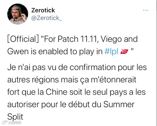 所幸经过了充足的时间做准备,事情在近期终于有了转机。昨晚上午拳头官方解说Zerotick发布推特,证实了11.11版本佛耶戈和格温可以在LPL比赛里被选用: