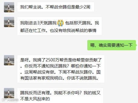 淡淡情本人认为被踢没事,关键是事先告诉一下。而且他表示,刚进帮几天,才捐满帮贡,就被踢了,在讨要说法无果后,他选择了“偷袭”。