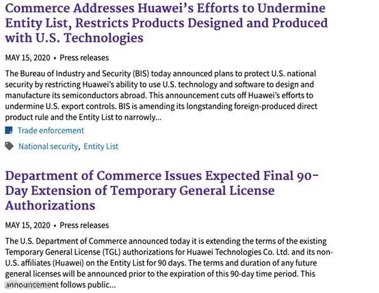 同日美国商务部还宣布,将实体名单上的华为技术有限公司及其非美国分支机构的现有临时通用许可证(TGL)授权期限延长90天。