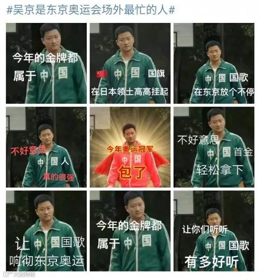 甚至就连吴京,也成了东京奥运会场外最忙的人,网友们最喜欢拿吴京中国这张图片来制作代表中国自豪骄傲情绪的表情包,马上也开始了一波整活: