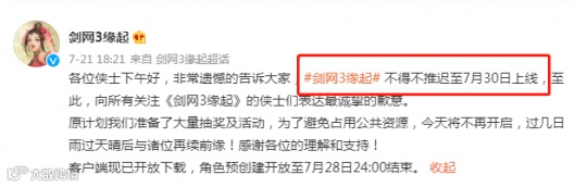 玩家期待已久的《剑网3:缘起》,原定于7月23日不限号不删档上线,不过近日官方发布公告称,为了避免占用河南救援的公共资源,取消了原计划的大量抽奖活动,剑网3怀旧版也推迟至7月30日上线。