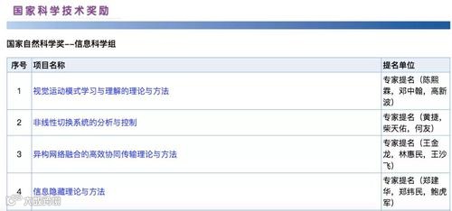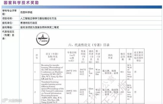 国家科技进步奖一等奖提名中,有屠呦呦提名的项目「中医药文献传承创新模式研究与应用」、袁隆平提名的项目「广适性骨干亲本Y58S创制与超级稻新品种选育」等。而在国家科技进步奖二等奖的提名中,包括陈薇、石正丽等人提名的项目「中国序列7型猪链球菌的发现、应对、致病机理和新传播模式」、李兰娟和魏于全等人提名的项目「铁稳态代谢的分子调控网络」等。在国家自然科学奖—信息科学组目录中,有三项人工智能项目入选。由香港特别行政区提名的项目《人工智能迁移学习基础理论与方法》被提名为国家自然科学奖二等奖,其中杨强教授作为主要完成人排名第一,戴文渊排名第二。杨强现任香港科技大学新明工程学讲席教授,是人工智能研究的国际专家和领军人物。戴文渊为人工智能企业第四范式创始人兼CEO。
