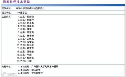 另外,在疫情期间作出重大突出的钟南山呼吸疾病防控创新团队也获得提名。2020年3月24日,国家科学技术奖励工作办公室官方网站发布公告,对2020年度国家科学技术奖1500多项受理项目进行公示。据国家科学技术奖励工作办公室公告显示,2020年度国家科学技术奖提名工作已结束,该办共收到有关单位和专家提名的国家自然科学奖项目333项,国家技术发明奖项目333项(通用项目266项,专用项目67项),国家科学技术进步奖项目1135项(通用项目952项,专用项目183项)。公告中还提到,形式审查不合格项目19项不予受理,其中国家自然科学奖3项,国家技术发明奖4项(通用项目),国家科学技术进步奖12项(通用项目)。提名单位撤回提名9项,其中国家技术发明奖3项(通用项目),国家科学技术进步奖6项(通用项目)。