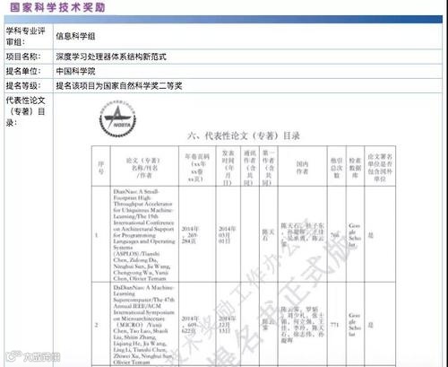 由中国科学院提名的项目《深度学习处理器体系结构新范式》被提名为国家自然科学奖二等奖,其中陈云霁、陈天石作为主要完成人分别排名第一、第二。陈天石为中科寒武纪创始人。