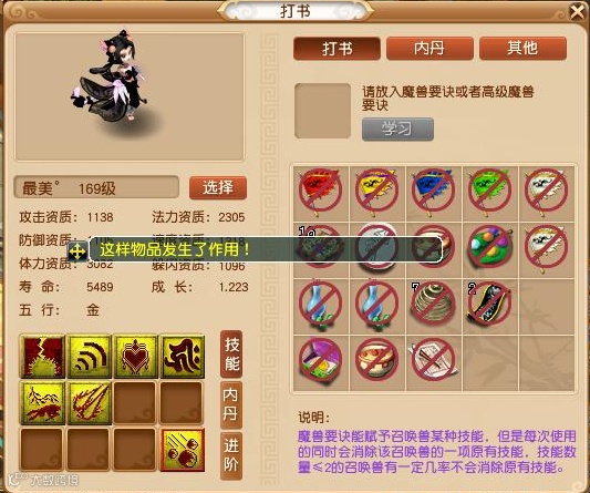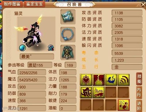可以看到这只猫灵的认证技能是泰山,其余技能是高级魔之心,高级法术暴击,再生,高级法术波动,须弥真言以及高级神佑复生。小编认为作为任务宝宝是很OK了,只是PK时有所欠缺,没必要冒险追加全红,万一掉须弥就从几千变几百了。