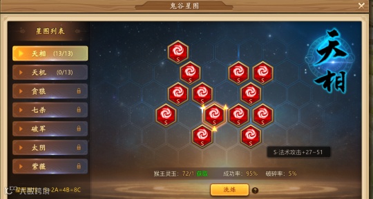 千古在宣传“资源全靠肝”时,我还以为是开玩笑,直到还没走出新手村就发现自己已经被肝淹没,不知所措了。比如星图,星图通常是需要靠着清怪后掉落的绿色品质物品来点亮,而光是新手村的怪就能够点亮7个格子。并且格子点亮分为S、A、B、C、D这5个等级,在新手村这种难度不高的地方一般人不刷到s是很难接受的,所以在不知不觉中又花了不少时间在这上面,却一点都不觉得空虚。