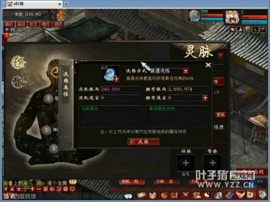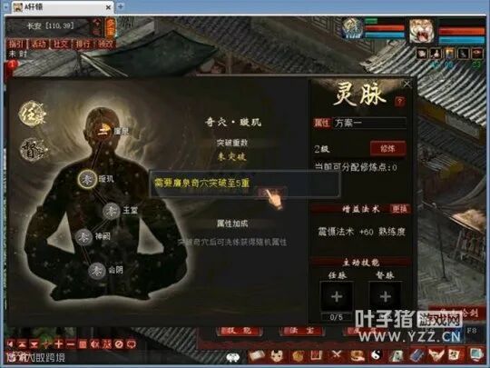 接着点击修炼按钮,可以看到灵脉等级提升的过程,修炼灵脉等级需要消耗修炼点,初始1个修炼点需要1000w的经验以及5000大话币来换取,一个修炼点可以进行穴位的一重突破。