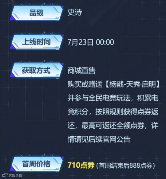 据悉,杨戬的新皮肤会在7月23日零点开启商城直售,首周710点券也是史诗皮肤的常规价格。不过凡是购买或赠送杨戬【天秀启明】的玩家都能参与全民电竞玩法,积累电竞积分,按照规则还可以获得点券返还,最高可返还全额点券。