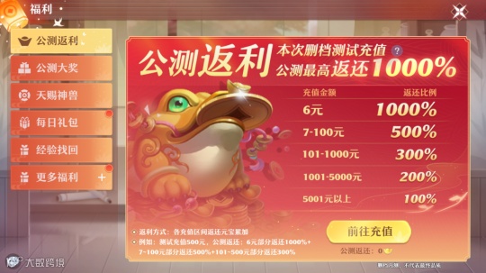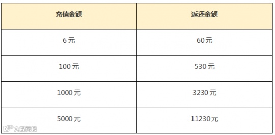 本次测试充值有高达1000%的返还比例,不过是分段式的,我把各档的返还金额整理了一下,希望能够帮助各位了解这个活动。