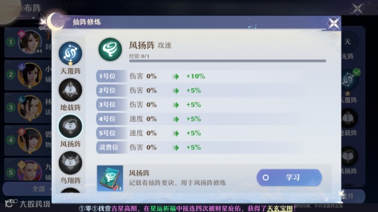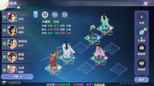 阵法产出途径:璇玑密藏、银币购买。阵法是一个在游戏中容易被忽视的部分,实际上阵法能够非常直观地提升我们的战力。仅仅是激活阵法便会为我们带来至少10%的属性加成,同时我们需要注意的是阵法存在克制关系;前期建议至少学会3个阵法(在被克制的时候可以切换)并且主升一个阵法。