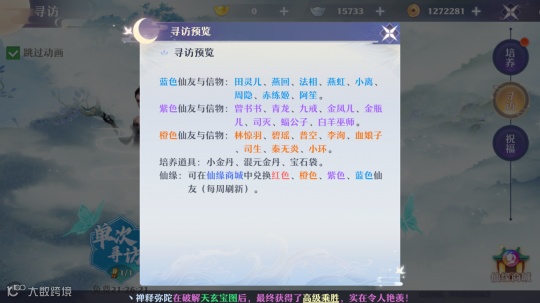 而且在角色等级达到52级之后,我们会解锁“仙友羁绊”系统,收集到特定的仙友组合并培养,可以解锁对应组合的“驭灵技能”。因此尽早注意累积仙友非常重要。