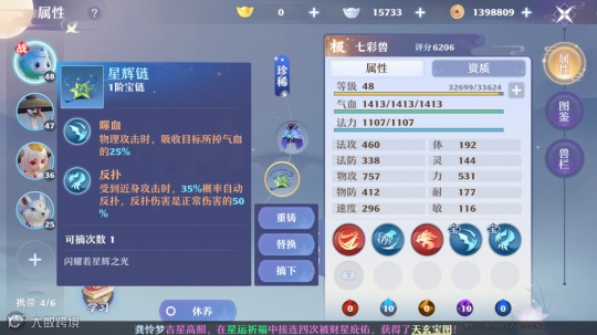 除了打书以外宝链和仙友也可以为灵兽提供额外的技能,因此如果考虑从技能数提高灵宠战力的话,先从宝链入手是比较实惠的方式。越高级的宝链可以携带的技能就越强,重铸功能可以让刷新宝链上附带的技能(有2个刷2个 有1个刷一个)。建议将神石留给双技能的宝链进行重铸。