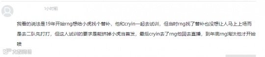 据网友爆料当时他跟Cryin还是竞争对手,在S9赛季曾在RNG竞争过中单位置。只不过RNG当时的想法是找一个替补作为轮换,而小草包却想把小虎挤出首发。